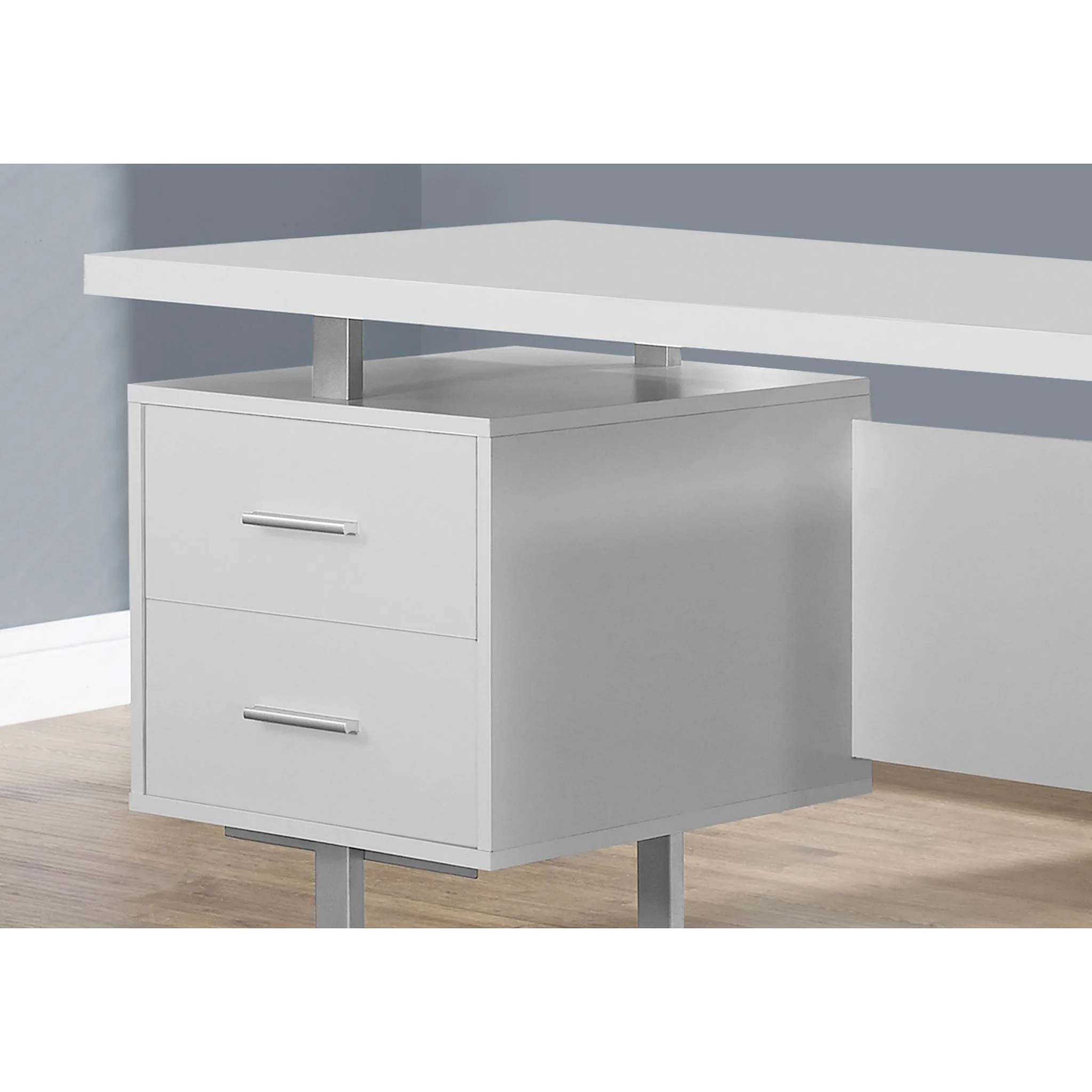 Feel like a boss in your home office when you sit down to work at this mid-size computer desk with 3 storage drawers. The thick-panel floating desktop provides generous room for a laptop and writing materials, and allows you to use the tops of the drawer units as extra surfaces. Finished in the same white laminate as the desktop, 2 small drawers and 1 large drawer with a bar for hanging files offer space for items you want to keep off the work surface. For flexibility, the drawer units are reversible and can be installed on either side according to your preference. Supporting the desk are metal legs in a silver finish with a modern, stylish U shape.
