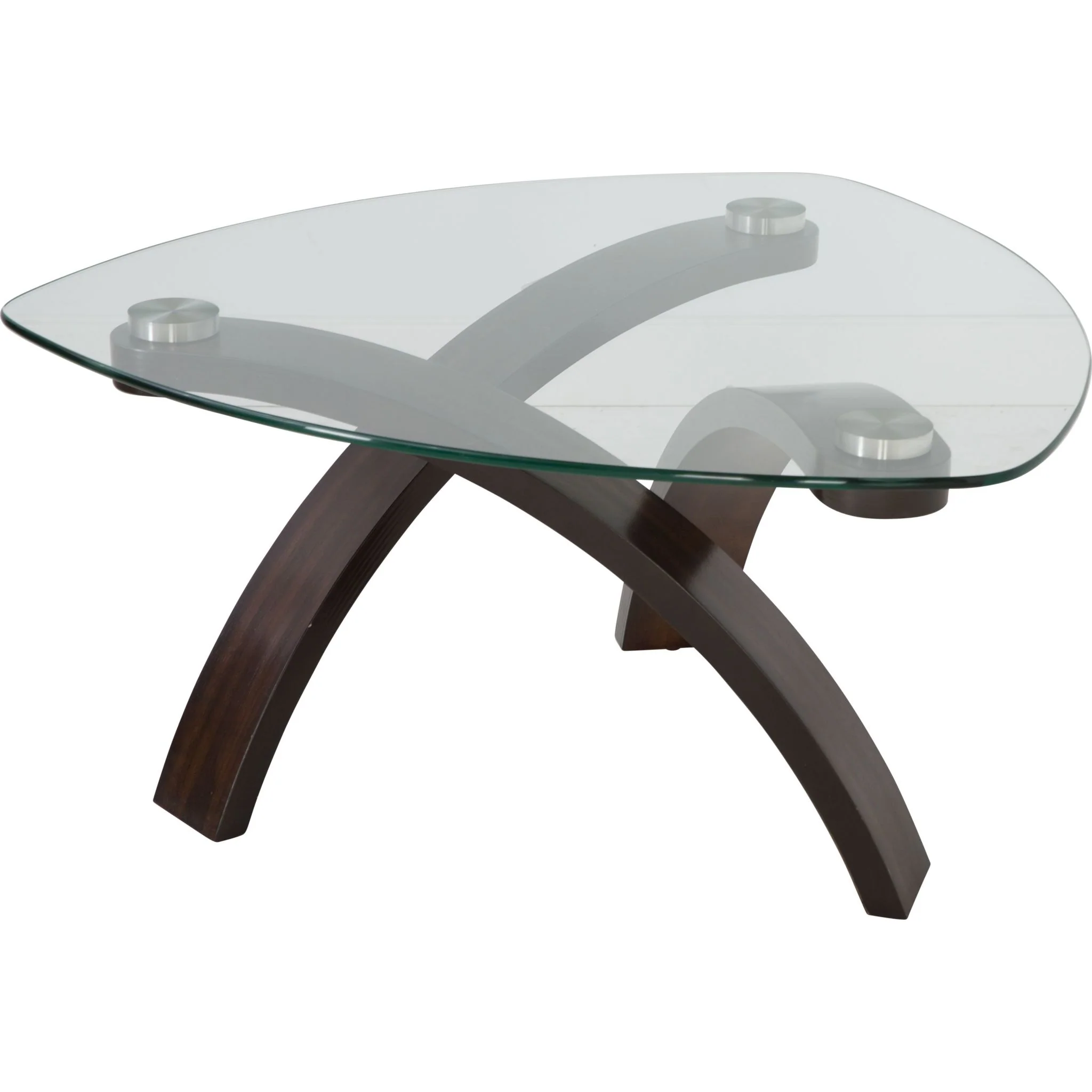 Define Modernism and Charm With the Allure Coffee Table A tastefully sculpted piece of furniture, the Allure coffee table sets the bar high when it comes to a sleek design and clean lines. A smooth glass top crowns crisscross legs, which feature a curved pattern. The bent plywood legs soften the look of this coffee table, enhancing its classy look. Simple and elegant, this coffee table features glass and metal accents that contrast the hazelnut finished legs. The Allure coffee table in hazelnut finish blends sophisticated aesthetics with a modern touch, making a bold design statement. The rounded triangular silhouette makes it trendy and reduces visual clutter. Pair with neutral-hued furniture and set this table over a plush rug with bold abstract motifs in neutral hues for a contemporary living room. This minimalist coffee table features plywood solids and walnut veneers at the base, giving it a luxurious finish. Featuring a 10 mm tempered glass tabletop, this Allure coffee table in modern style will gather compliments for its unique looks. The Allure coffee table features a modern and minimalist silhouette Arched legs and a pie-shaped glass top add it to its exquisite finish Features stylish metal accents and polished hazelnut legs Dimensions: Coffee table top, 34.00 W x 34.00 D x 0.50 H; Coffee table base, 28.00 W x 25.00 D x 18.00 H