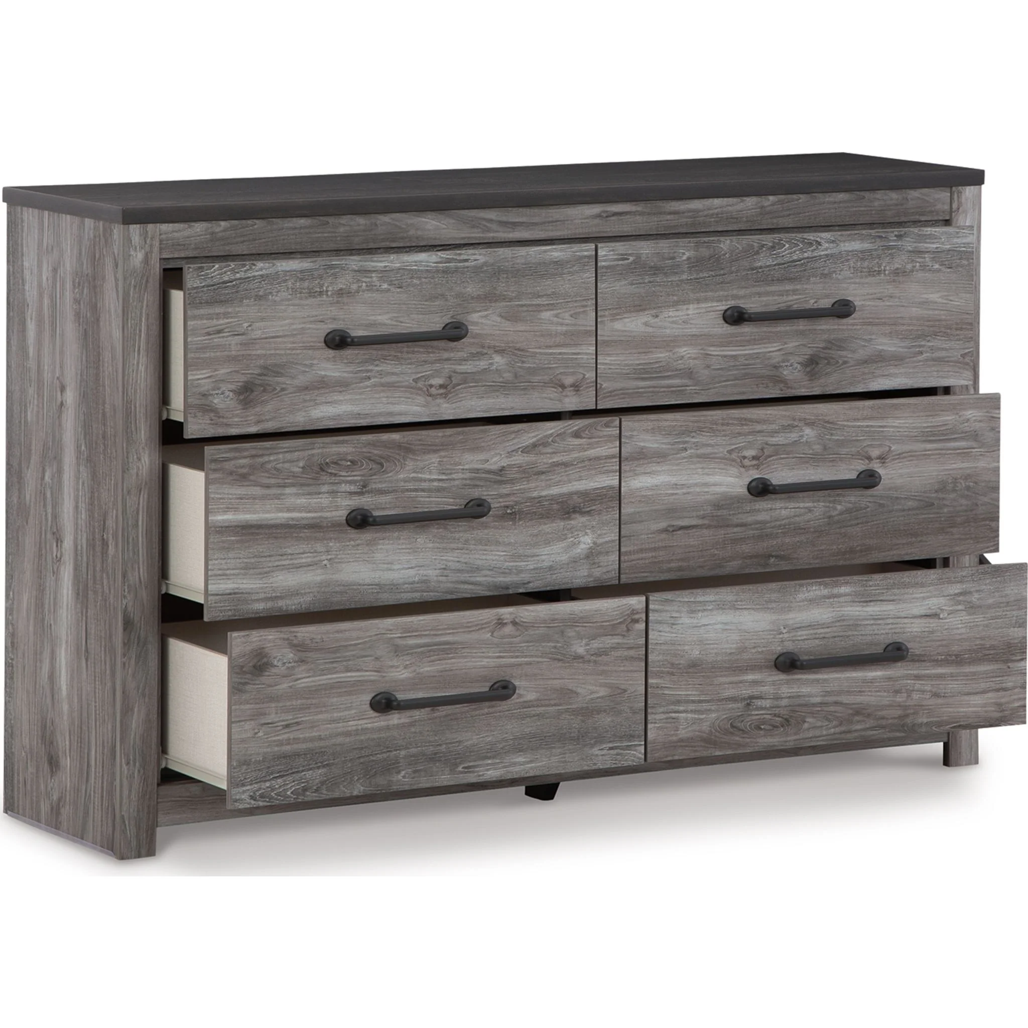 Alluring smoky gray hues create an ambiance that just feels right. The Bronyan 6-drawer dresser has a charming wood-like appeal enriched by a two-tone, textured look. Light neutral shades contrasted by a dark charcoal finish bring a refined yet relaxed feel to contemporary decor and a sense of serenity to your space.