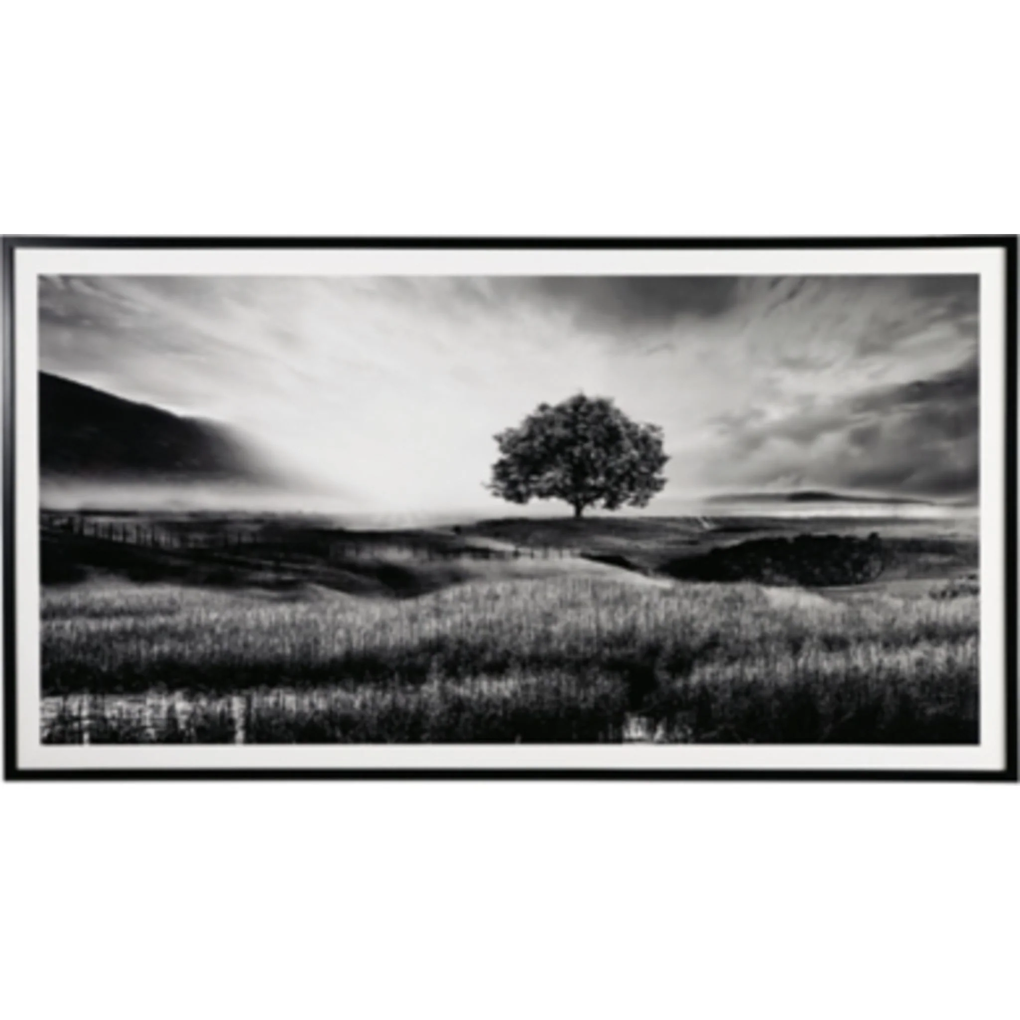 Filled with calming natural elements, this wall art has a refined look with a restful feel. It captures a landscape with rolling hills, drawing your eye to the tree standing tall in the center of the creation. Lighter tones in the clouds bring brightness to the black and white design, making for a striking addition to your modern decor.