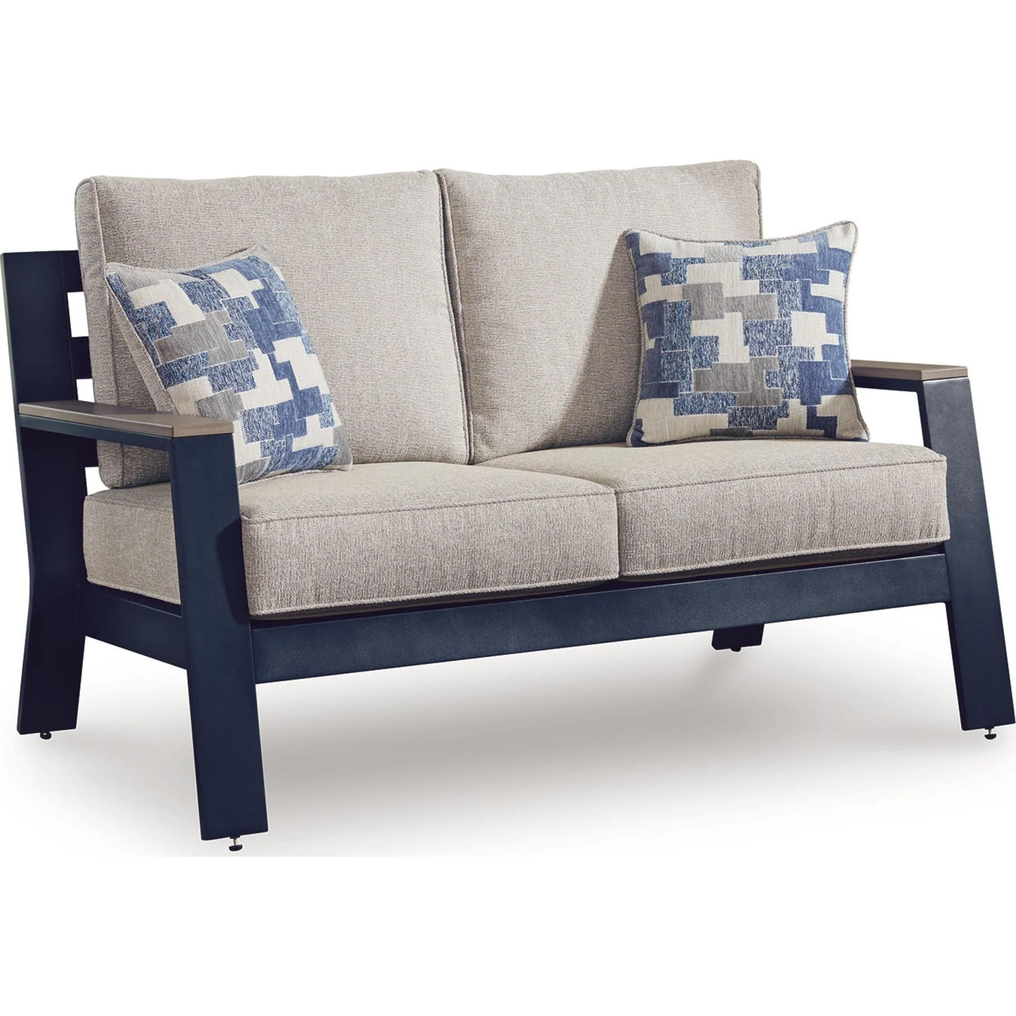 Easy-breezy beauty, made to withstand the elements. This outdoor loveseat makes a serene statement with its soothing shade of blue and contrasting wood-look arms. A cushioned seat and back keep you comfy as you lounge. Crafted with durable materials for added longevity, it's a smartly stylish addition to your outdoor oasis.