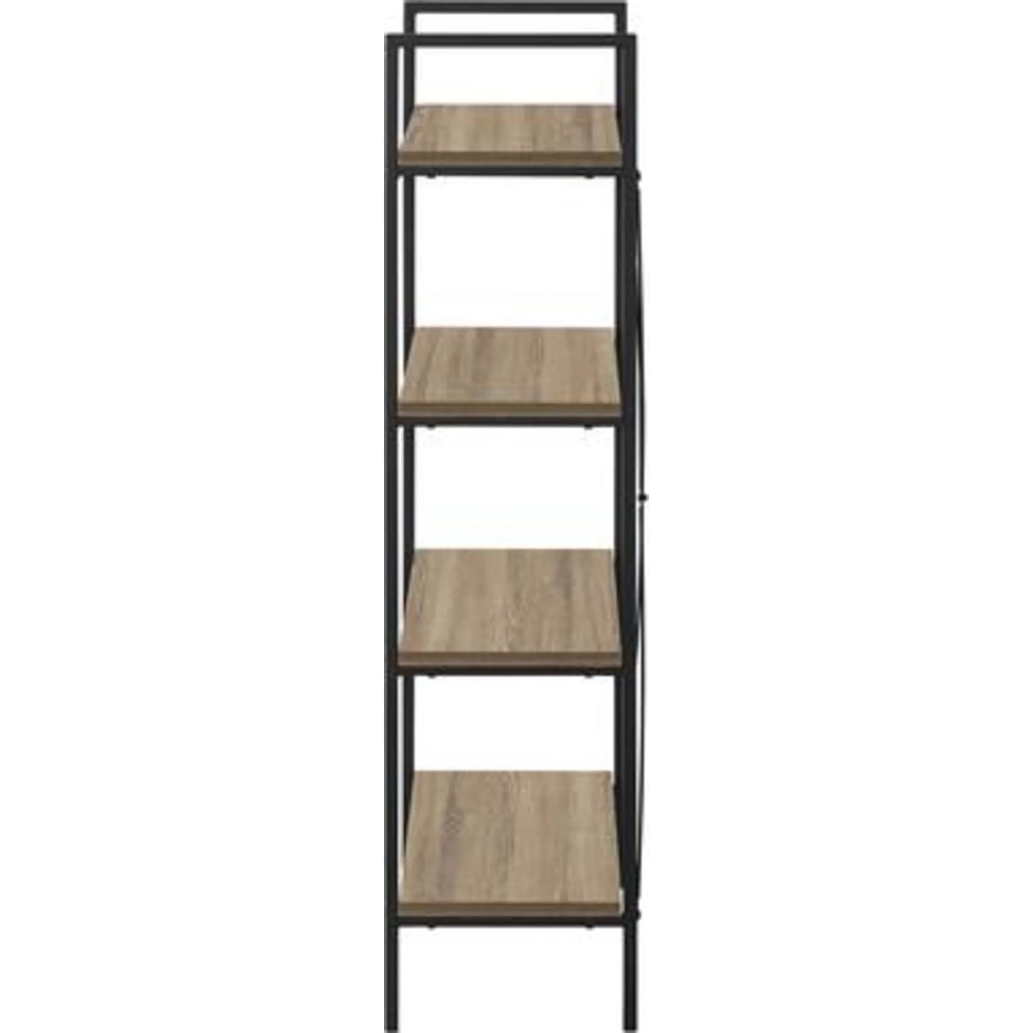 We love the classic linear structure of this modern freestanding shelving unit. The Four-tiers of solid shelving are sleek and understated, making this is an ideal piece to show off your collectibles, framed photographs, objects d art, and even a house plant or two. It has a metal frame that is reinforced by a metal crossbar across the open back. The shelves are crafted from engineered wood. Simple and elegant, this bookcase will work in any office space, Livingroom or bedroom.