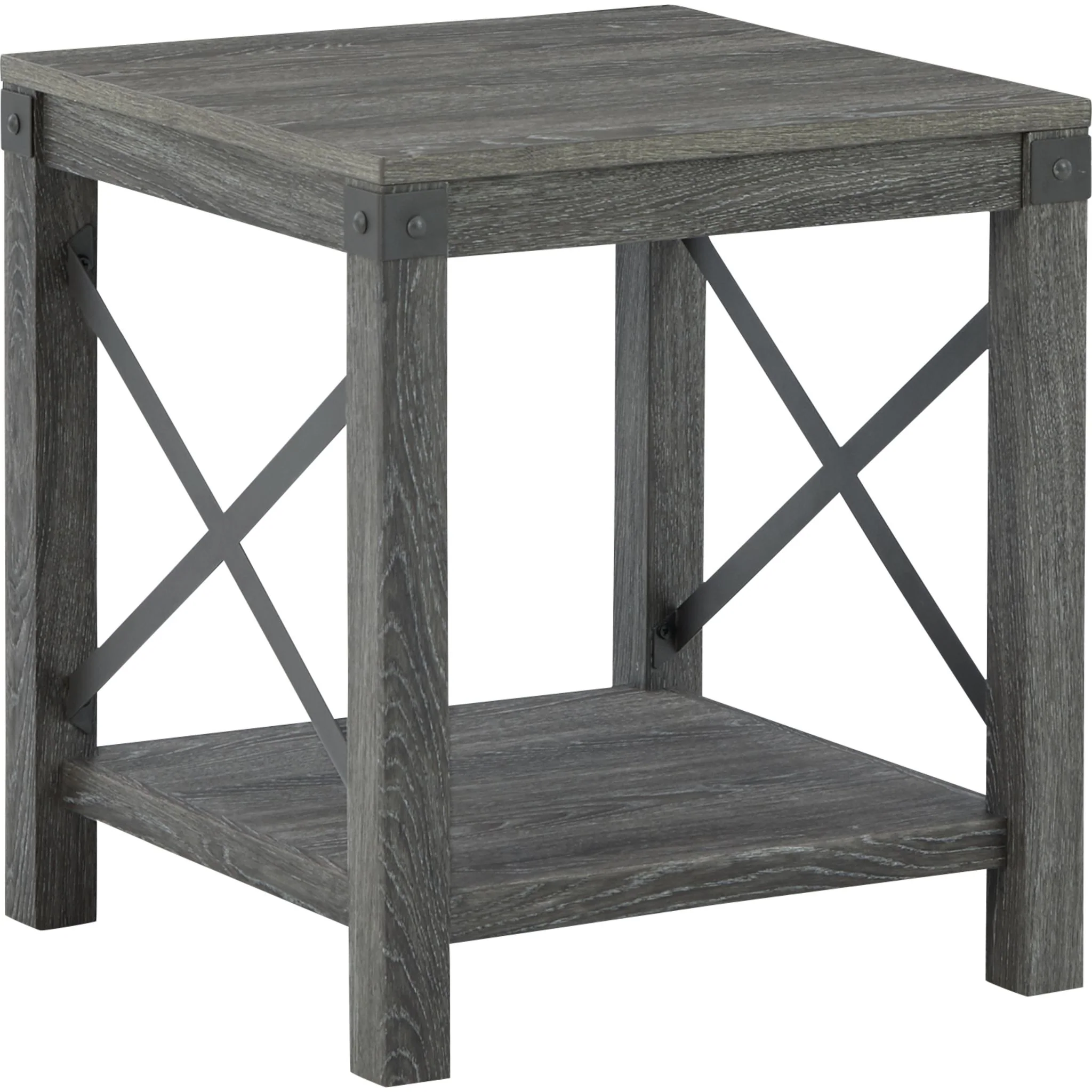Open the door to modern farmhouse style with this square end table. The beautiful woodgrain look and classic crossbuck metal accents are a cool touch, while the lower shelf provides surface space for fashionable home accessories.
