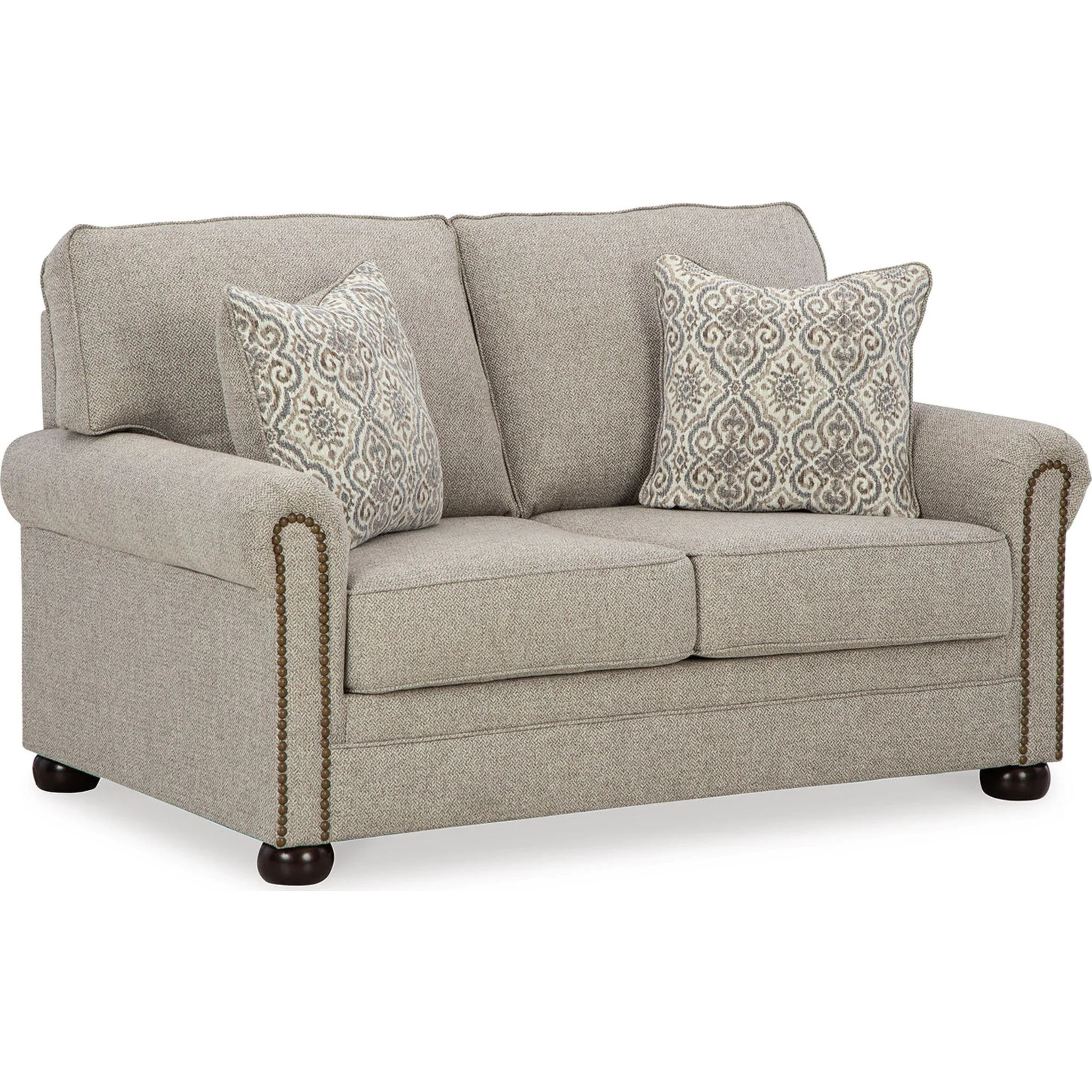 Inspired by the past but rooted firmly in the present, this loveseat complements your transitional seating area. Its versatile upholstery is delightfully detailed for a subtle herringbone effect. Designer touches like decorative nailhead trim and bun legs add traditional character. With this loveseat's reliable style and comfort, all you need to do is sit back and relax.