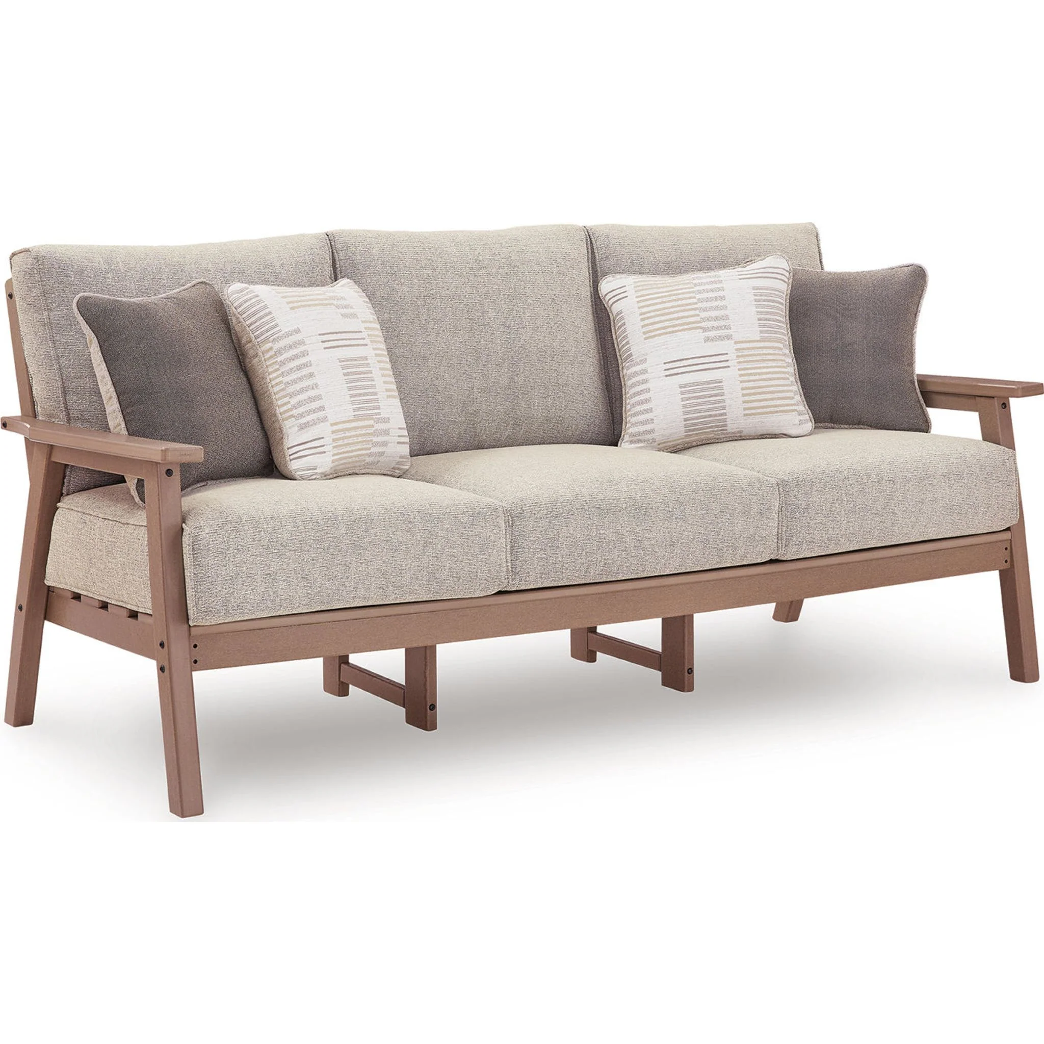 Natural neutrals are all the rage. Embrace the style trend with this outdoor sofa. Crafted with MEGA-TUFF® HDPE material, this chair combines the exceptional durability and weather resistance you need with the wood look you love. Comfy cushions wrapped in our high-performing, low-maintenance Nuvella® fabric offer stylish and durable appeal, taking outdoor living to a whole new level. Coordinating accent pillows add a wonderful layer of interest.