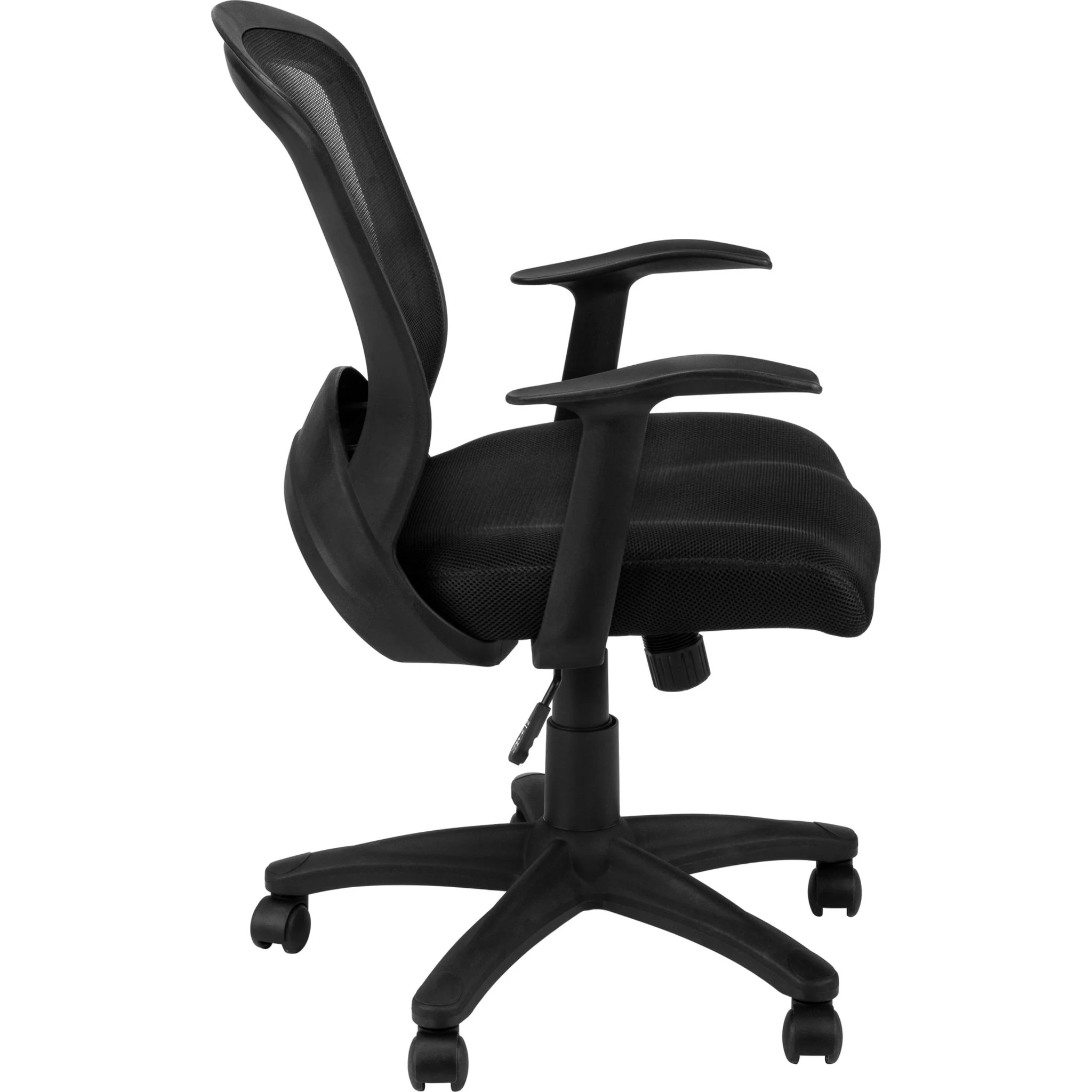 This mid-back office chair has curves in all the right places to provide comfortable support. The wide backrest has an ergonomic shape that follows the contour of the spine to promote good posture. The fixed armrests in black are grooved with a concave shape to better support the lower arms. Black mesh fabric covers the backrest and padded seat, which is wide and extra deep to offer a roomy feel. A lever underneath the seat allows you to adjust the chair height and tilt function to your preference. The seat swivels 360 degrees and the black 5-star base with casters lets you easily move around your workspace. With its streamlined style, this desk chair is ideal for a smaller home office.