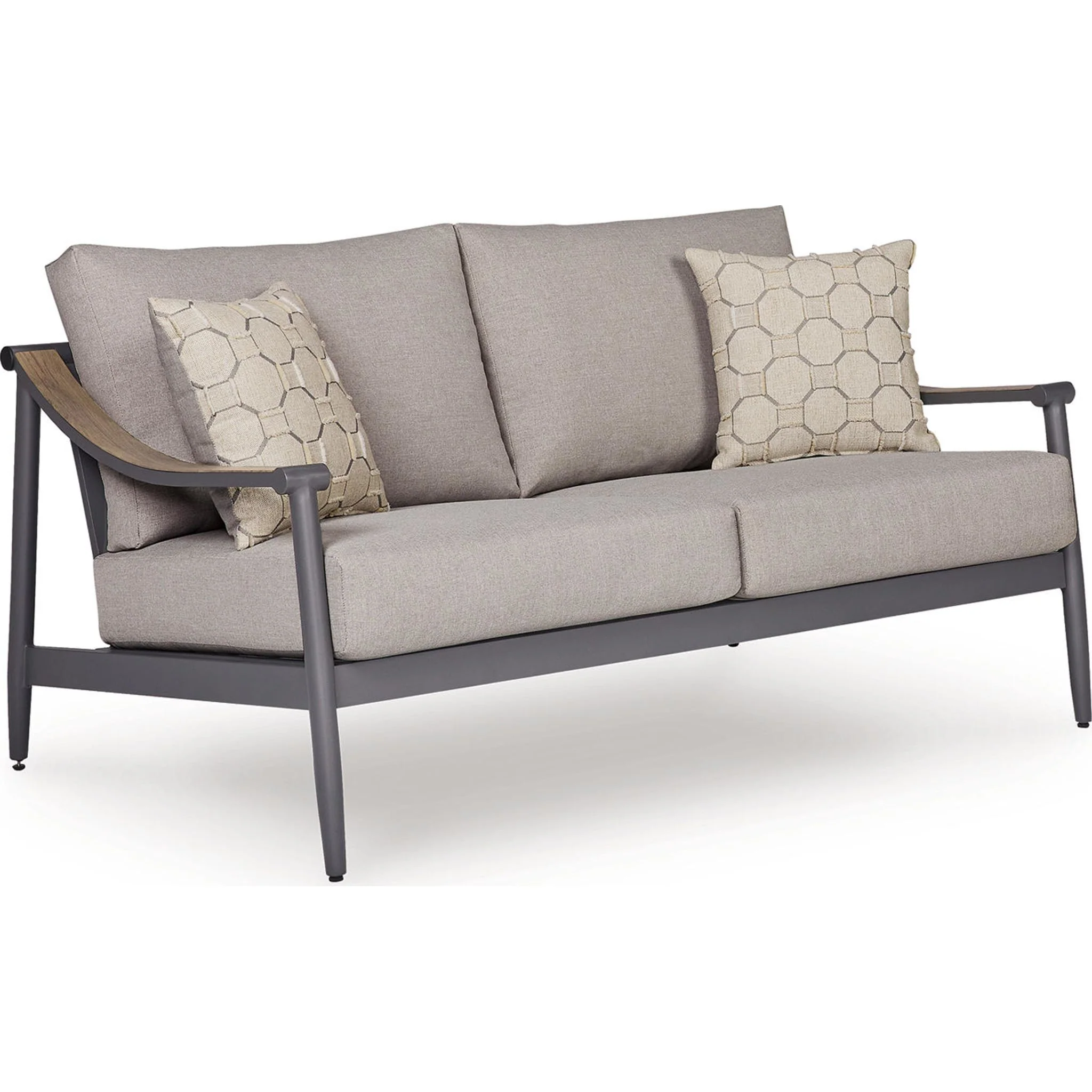 A refined marriage of style and durability, this outdoor loveseat adds contemporary flair to your porch or patio. Wood tones and shades of gray lend a versatile, neutral appeal. And this loveseat is built to last, thanks to its rust-resistant frame and cleanable, UV-resistant fabric.