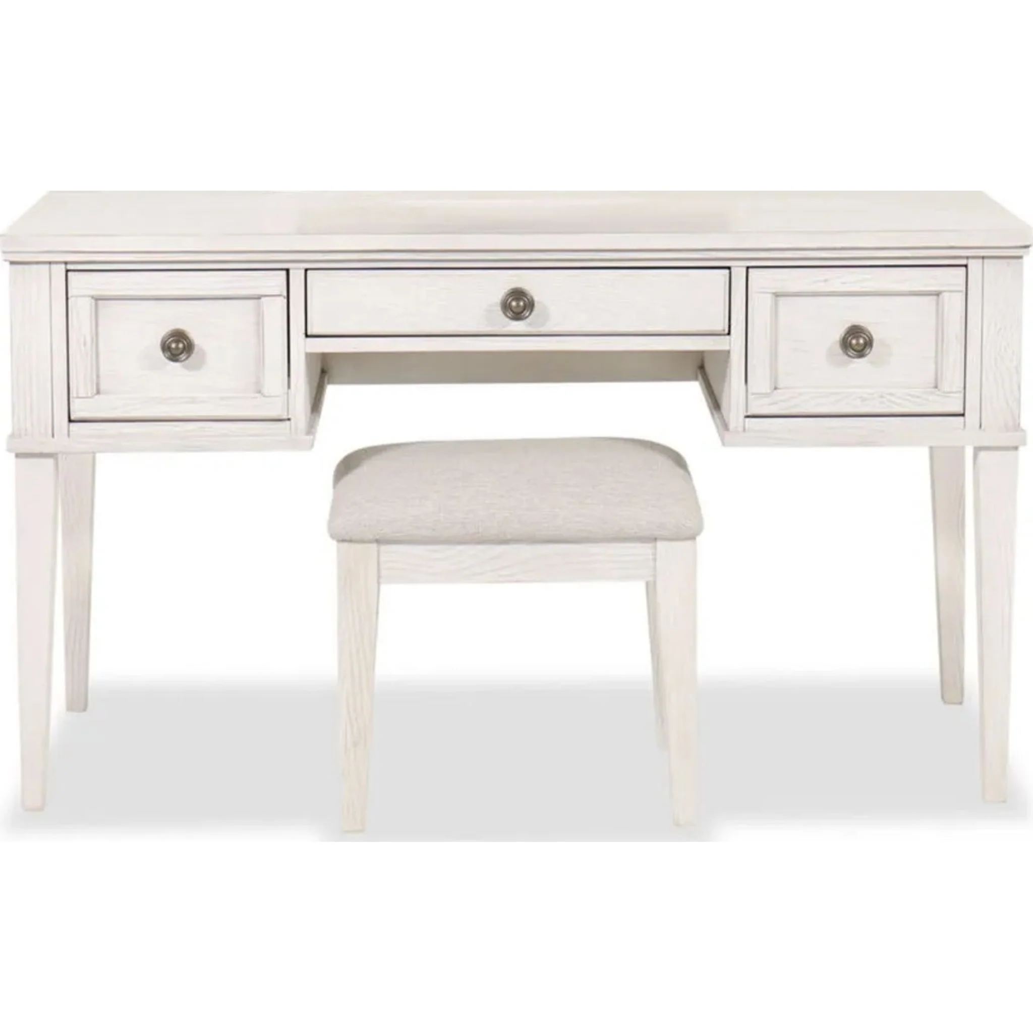 Elegant, timeless furnishings take your bedroom to the next level. Nothing does that better than this vanity and stool set. The antiqued white finish with a wonderful grain texture oozes sophistication, while dark bronze-tone knobs add an ornate touch. Three storage drawers and a soft cushioned seat round out this tasteful set.