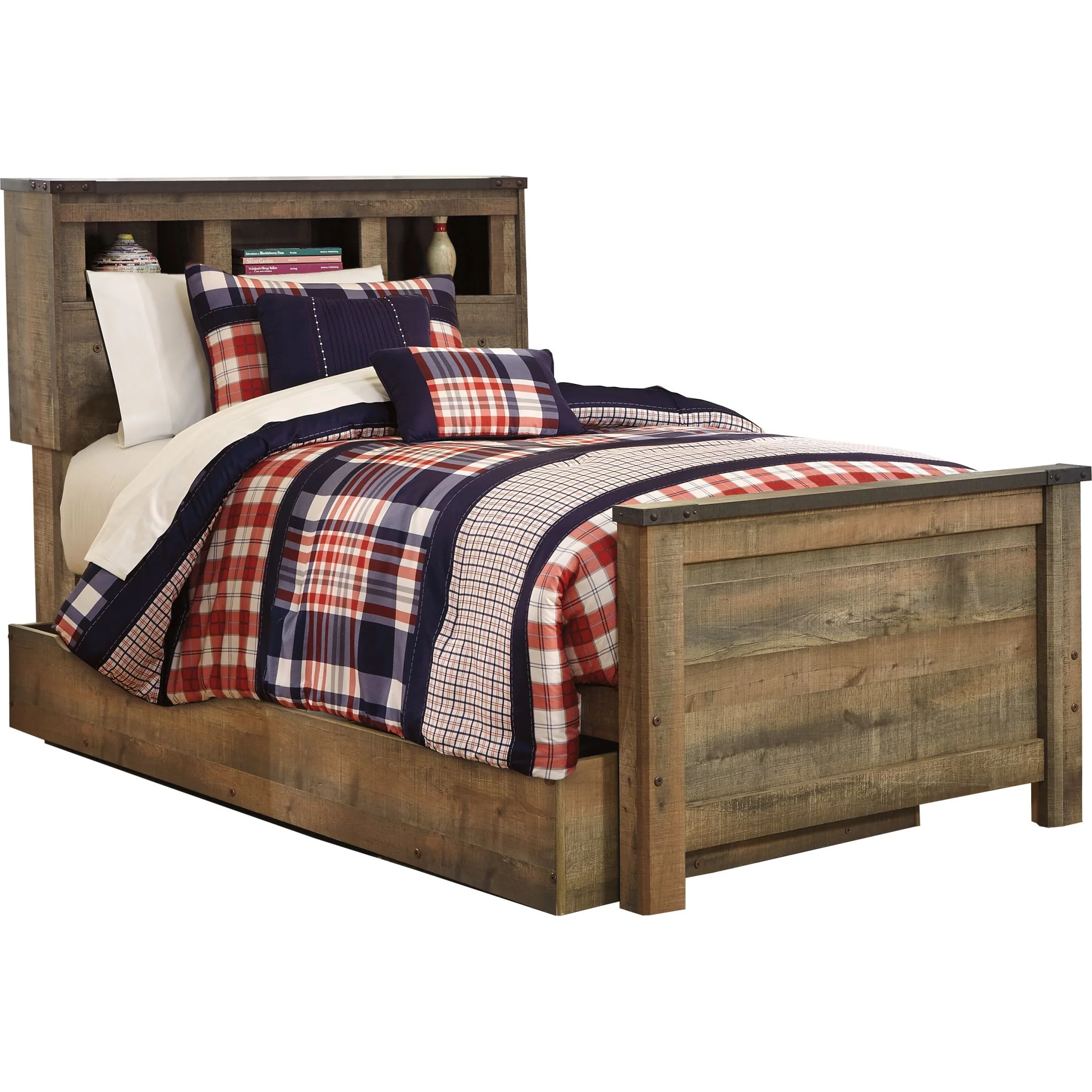 Whether she loves horses or he's a cowboy at heart, this twin bookcase bed with under bed storage matches their authenticity. Rustic finish, plank-style details and nailhead trim pay homage to reclaimed barn wood, making for a chic look loaded with charm. Mattress available, sold separately.